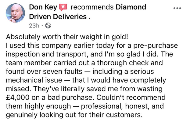 Before moving any vehicle, we carry out a visual safety check, including tyres, lights, fluid levels, and a start/move assessment. Mileage and VIN are verified to confirm accuracy and identity.